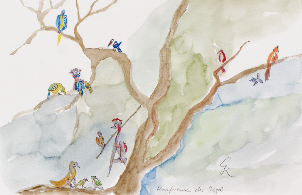 Dies ist die Website der Münchner Künstlerin Gertraud Riegl. Das Bild der Woche: Konferenz der Vögel - Aquarell